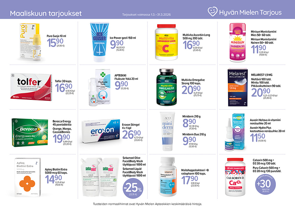 Maaliskuun tarjoukset ovat voimassa kaikille asiakkaillemme Apteekki Koilliskeskuksessa ja Peltolammin apteekissa sekä ApteekkiOstos.fi -verkkoapteekissa 1.-31.3.2026 tai niin kauan kuin tarjouserää riittää. Lisää tarjoustuotteita löydät apteekilta!